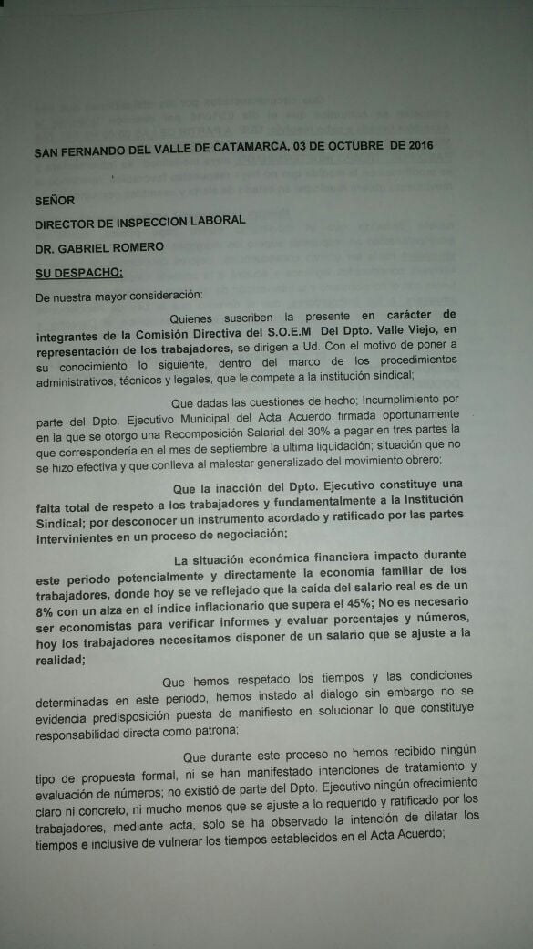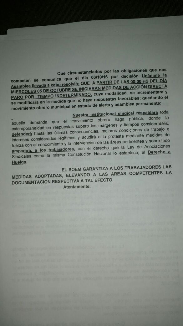 En una nota dirigida a la Dirección de Inspección Laboral, el gremio argumenta que están dadas las "condiciones de hecho" para convocar a una medida de fuerza, ya el municipio incumplió el acta acuerdo en la que se otorgó una recomposición salarial del 30% a pagar en tres partes "la que correspondería en el mes de septiembre la última liquidación”.