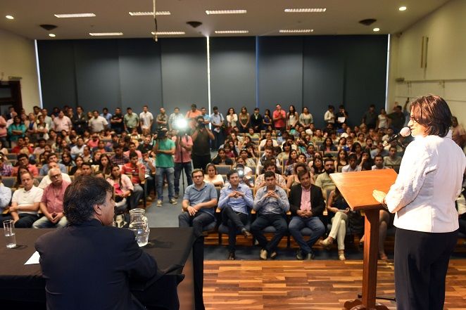 "A los emprendedores quiero decirles que para mí es una enorme satisfacción verles las caras. Hay gente de mi edad, pero la mayoría son jóvenes. Animarse a emprender es todo un desafío, animarse a emprender es ir por la senda menos cómoda de la vida. Porque más cómodo es tener un empleo con un salario determinado que si o si a fin de mes va a cobrar, y esto no es que no tenga valor, tiene valor porque tienen que ir a trabajar y cumplir con su tarea. Pero en verdad el trabajo cuando uno es empleado tiene un piso seguro pero también tiene un techo, el que decide emprender tiene un piso muy inseguro, hasta que se consolida, pero no tiene techo.