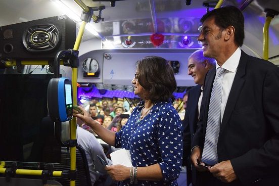La mandataria se convirtió en la primera pasajera en utilizar el nuevo sistema, en el acto desarrollado junto al ministro de Servicios Públicos, Guillermo Dalla Lasta.