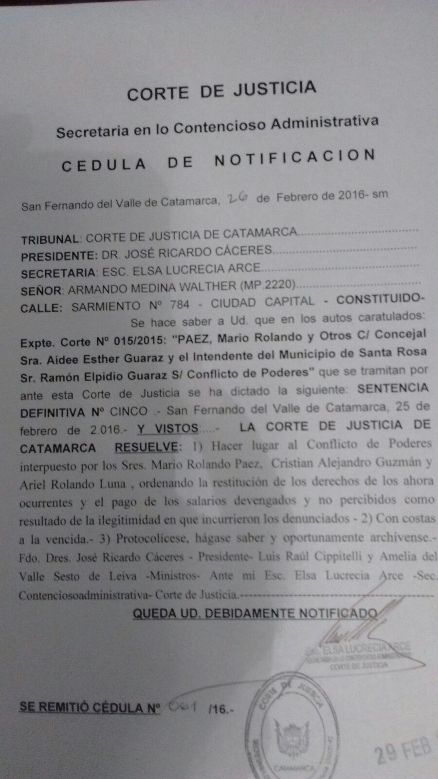 En la sentencia, los miembros del Tribunal Mayor catamarqueño, ordenan "restituir los derechos de los ahora ocurrentes, y el pago de los salarios devengados y no percibidos como resultado de la ilegitimidad en la que incurrieron los denunciados. Todo ello con costas a la vencida".