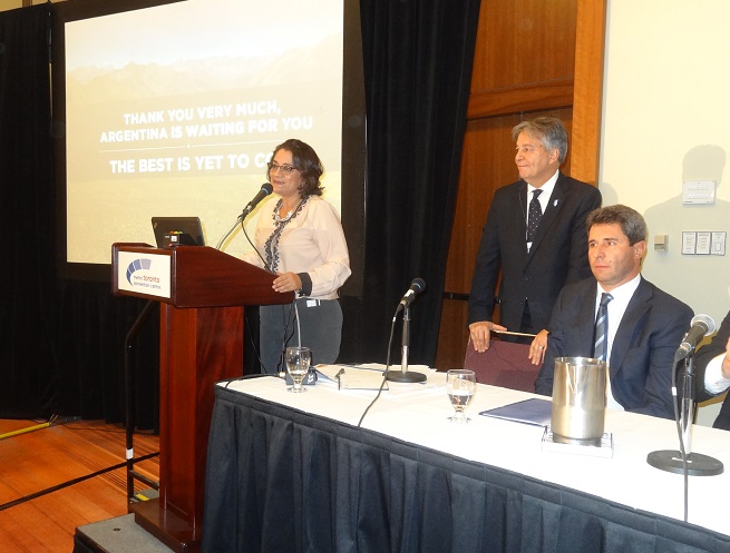 La Gobernadora, en Toronto y ante un nutrido público de empresarios, motivó la inversión en la Provincia. Resaltó que se trabaja en varios prospectos mineros que están listos para quienes deseen desarrollarlos como Cerro Atajo, Filo de las Vicuñas, Vernancua, entre otros.