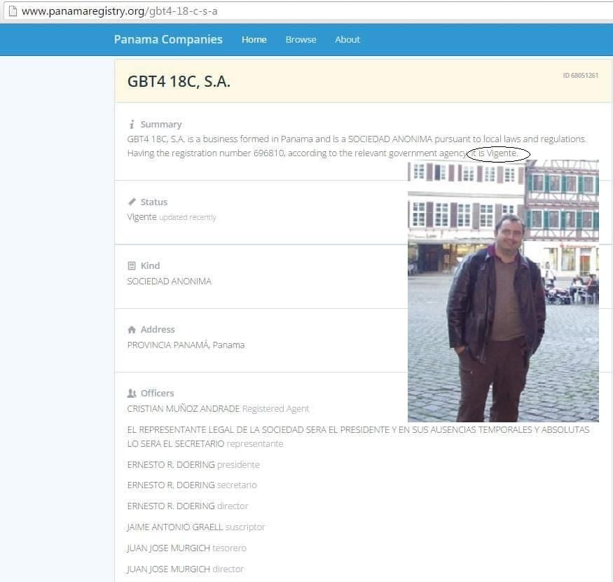 Según los registros dados a conocer por la investigación periodística #Panamapapers sobre lavado de dinero en paraísos fiscales,Doering es Presidente y Director de GBT4 18 S.A, empresa actualmente activa.
