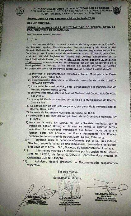 presentar la documentación que respalde. La requisitoria tiene la firma del presidente