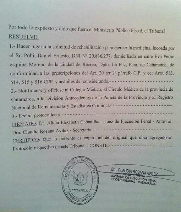 En el fallo, se ordena notificar el mismo "al Colegio Médico, al Círculo Médico, a la División Antecedentes de la Policía de la Provincia, y al Registro Nacional de Reincidencias y Estadística Criminal".