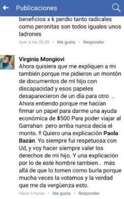 "Ahora entiendo porque me hacían firmar un papel para darme una ayuda económica de $500 para poder viajar al Garrahan, pero arriba nunca decía el monto. Quiero una explicación Paola Bazán”, reclamó la madre.