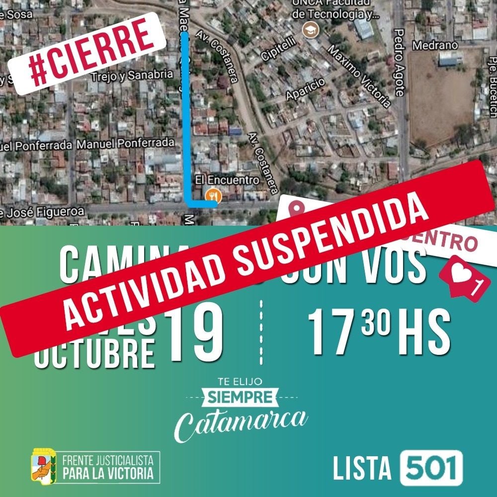 El Frente Justicialista para la Victoria informó que, por una cuestión de sensibilidad y respeto hacia la familia del joven Santiago Maldonado, se ha decidido suspender las actividades de cierre de campaña previstas para hoy.