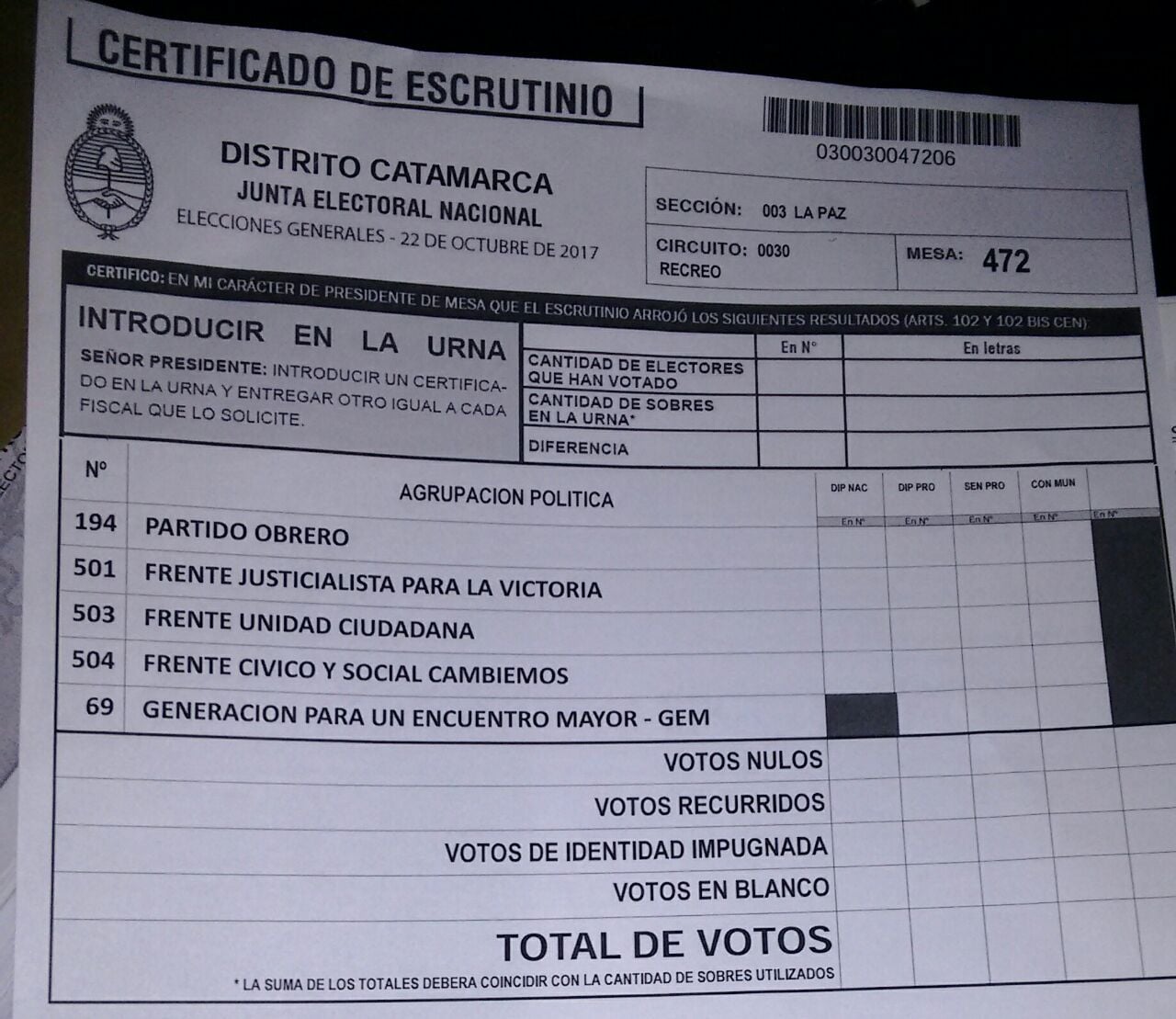 Sección 003 - La Paz, Circuito 0030 - Recreo, según informó la Junta Electoral