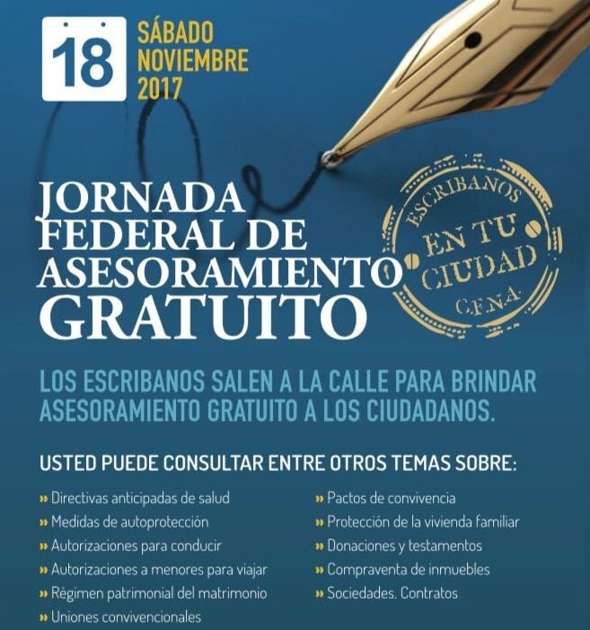 En un mismo día y a la misma hora, sábado 18 de noviembre desde las 9 hasta las 13 horas, se brindará asesoramiento notarial gratuito en las principales ciudades del país y, de esa forma, los ciudadanos podrán consultar entre otros temas sobre : directivas anticipadas de salud, medidas de autoprotección, autorización para conducir, autorizaciones a menores para viajar, régimen patrimonial del Matrimonio, uniones convivenciales, pactos de convivencia, protección de la vivienda familiar, donaciones y testamentos, Compra venta de Inmuebles, Sociedades, contratos.