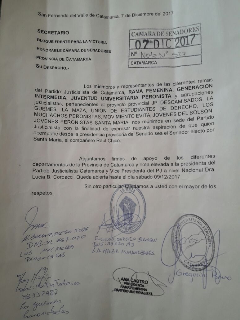 En este contexto, varias organizaciones expresaron su respaldo, mediante nota, al senador electo por Santa María, Raúl Chico, para ser erigido como Presidente Provosirio del Senado.