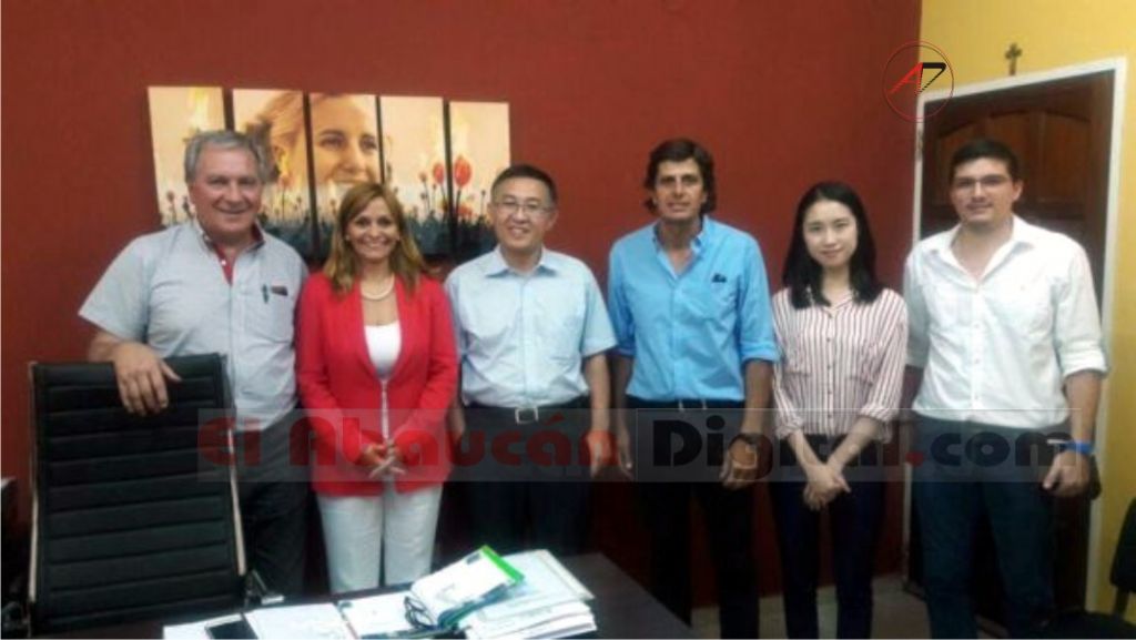 Los visitantes Lyu Jiewen y Zhai Chengyu junto al Ministro de Obras Públicas Rubén Dusso mantuvieron una reunión con la mandataria municipal a la que sobre el final la calificaron de muy positiva.