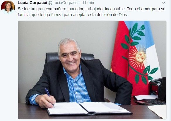 En su cuenta de Twitter la gobernadora Lucía Corpacci lamentó el fallecimiento de su Vicegobernador, a quien calificó como un "gran compañero, hacedor, y trabajador incansable"