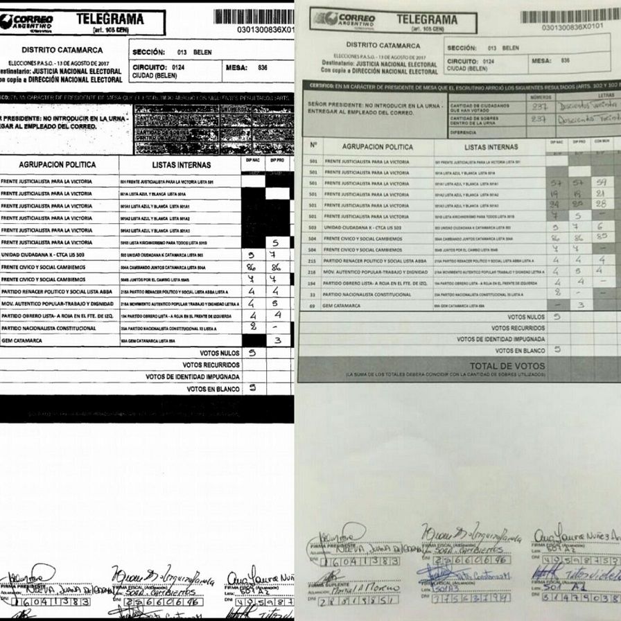 telegramas que se cargaron en el escrutinio provisorio de Andalgalá, Capital y