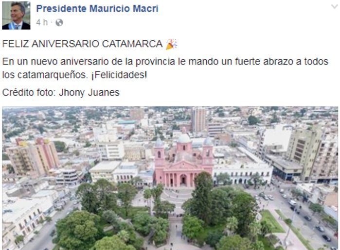 A través de su cuenta de Facebook, el Presidente de la Nación se refirió a la fecha y envió un abrazo y felicidades al pueblo catamarqueño.
