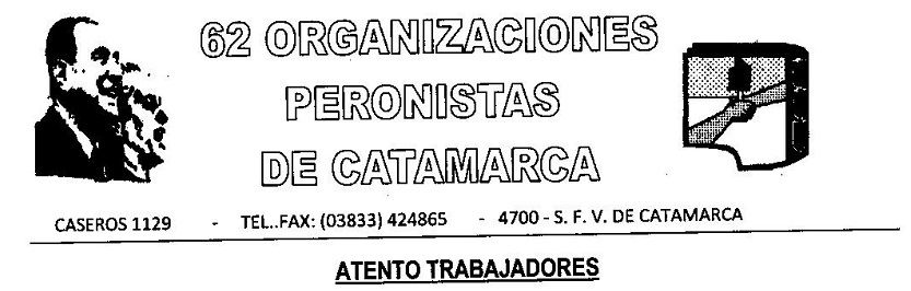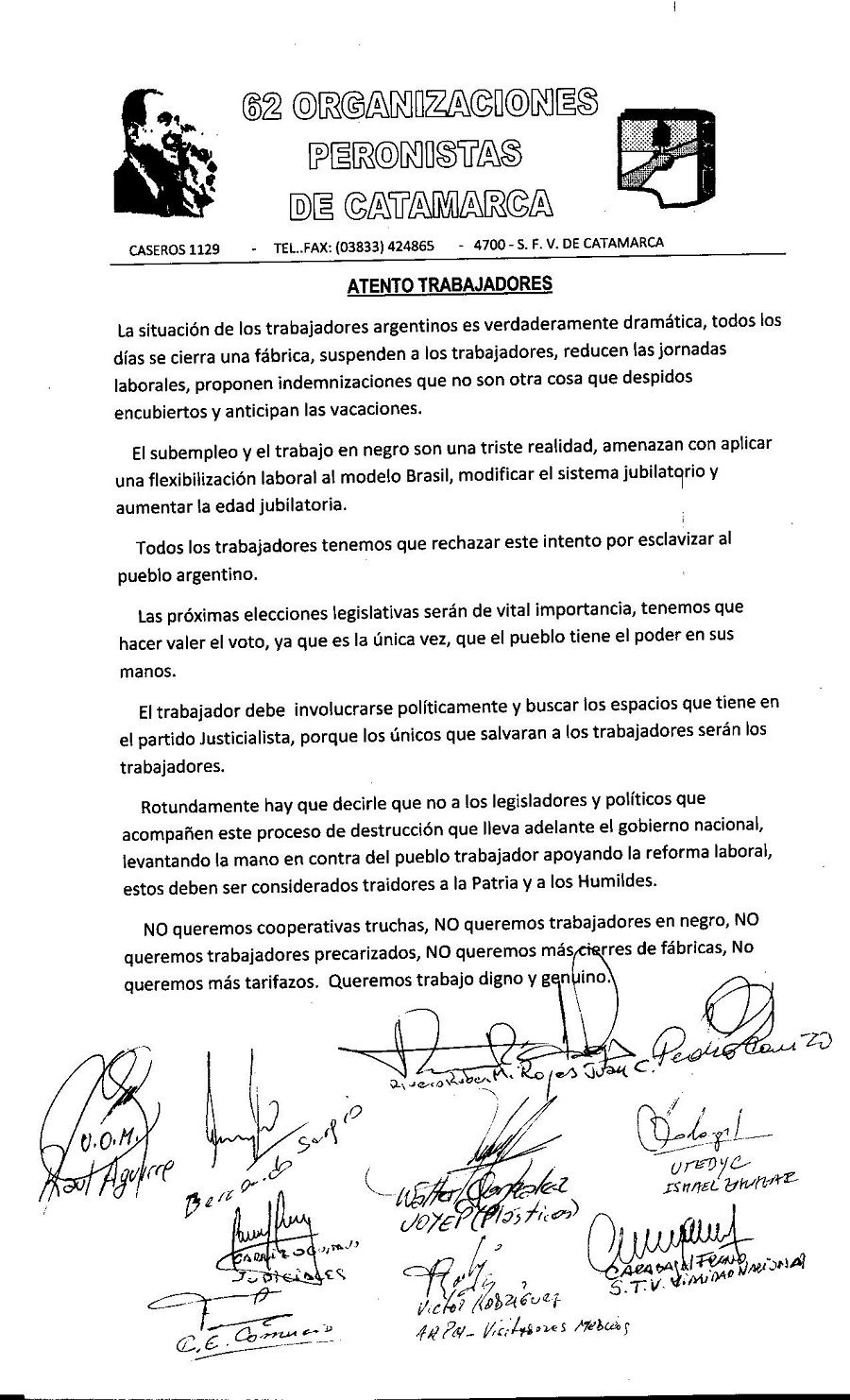 Firman, entre otros, Pedro Armando Carrizo (UTA), Juan Carlos Rojas (Gastronómicos), Raúl Aguirre (UOM), Servicio Berrondo (Viales Provinciales), Alfredo Carabajal (Vialidad Nacional)Gustavo Carrizo (Judiciales), Víctor Rodríguez (Visitadores Médicos), Pedro Fernández (Mercantiles), Walter González (Plásticos) e Isamel Zalazar (UTEDYC).