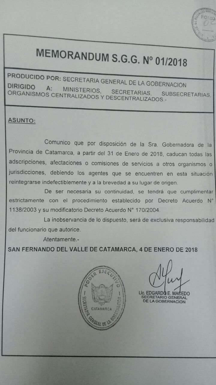 "Comunico que por decisión de la gobernadora de la provincia de Catamarca, a partir del 31 de enero de 2018, caducan todas las adscripciones, afectaciones, o comisiones de servicio a otros organismos, o jurisdicciones, debiendo los agentes que se encuentren en esta situación reintegrarse indefectiblemente y a la brevedad a su lugar de origen", reza el memorandum firmado por Macedo.
