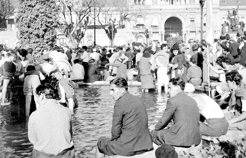 “Fue el día en que la historia argentina cambió definitivamente. En aquella calurosa jornada, a la que se simboliza con la imagen de los trabajadores refrescando “sus patas” en las fuentes de la Plaza de Mayo, los trabajadores impusieron a las clases dominantes su voluntad de afianzar las conquistas que habían obtenido hasta entonces de la mano de Perón, por ese tiempo detenido y confinado a la isla Martín García.