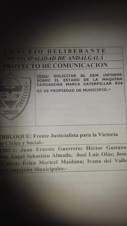 Por pedido de la comunidad en la vía pública, medios de comunicación y por una imagen que se viralizó en las redes sociales y WhatsApp, los concejales del bloque Frente Justicialista para la Victoria, decidieron solicitar un pedido de informe al Ejecutivo Municipal, Alejandro Páez, acerca de la situación de una máquina cargadora marca Caterpillar 924 GZ, de propiedad del municipio.
