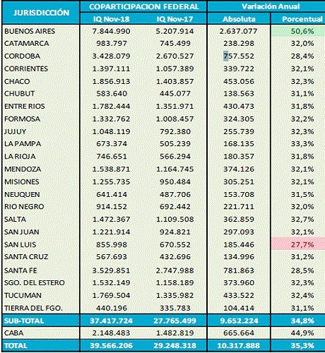 Durante la primera quincena de noviembre la Coparticipación Federal de Impuestos tuvo un incremento del +35,3% respecto a la misma quincena de noviembre de 2017, totalizando $39.566 millones, según la consultora Economía y Regiones.