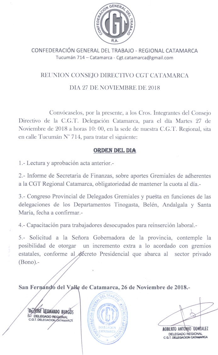 La convocatoria es para mañana martes 27 de noviembre, a las 10, en la sede de la CGT Regional, sita en calle Tucumán N° 714.