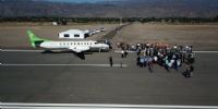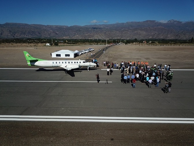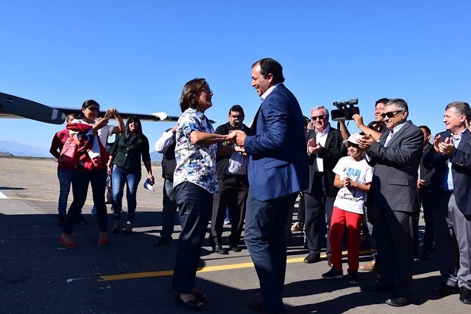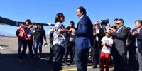 El intendente junto a la gobernadora y todos los presentes, vivieron con mucha emoción el arribo del primer avión a la ciudad.