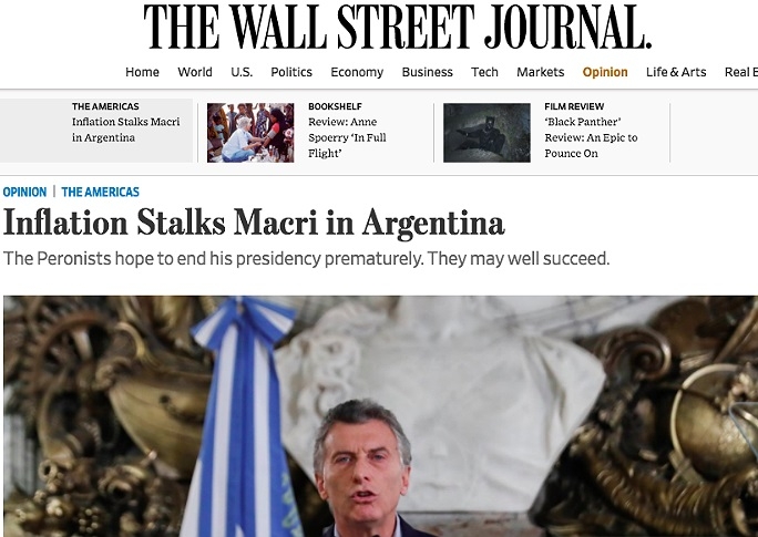 El Wall Street Journal puso la lupa en la inflación de Cambiemos y consideró que el mayor logro de su gestión sería terminar el mandato en 2019. La periodista Mary Anastasia O'Grady señala en el artículo "La inflación acecha a Macri en Argentina" y comenta sobre los problemas que observa en la actual gestión.