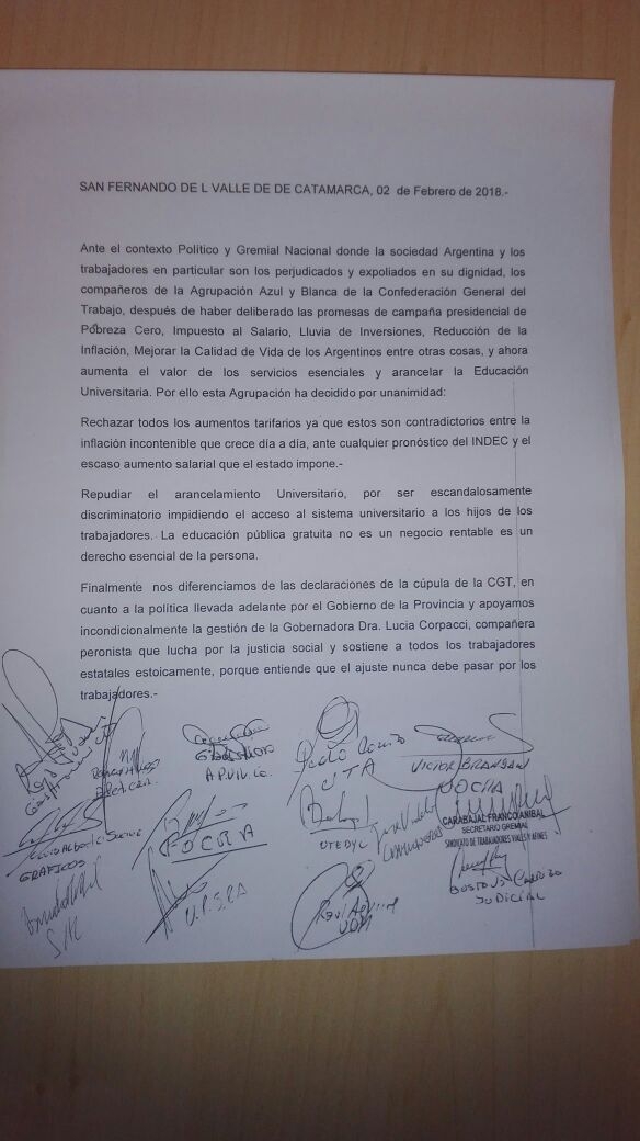 “Por ello rechazamos todos los aumentos tarifarios ya que estos son contradictorios entre la inflación incontenible que crece día a día, ante cualquier pronóstico del INDEC, y escaso aumento salarial que el Estado impone. Repudiamos el arancelamiento universitario por ser escandalosamente discriminatorio impidiendo el acceso al sistema universitario a los hijos de los trabajadores. La educación pública gratuita no es un negocio rentable, es un derecho esencial de las personas. Finalmente nos diferenciamos de las declaraciones de la cúpula de la CGT en cuanto a la política llevada adelante por el gobierno de la provincia y apoyamos incondicionalmente a la gestión de la gobernadora Lucia Corpacci, compañera peronista que lucha por la justicia social y sostiene a todos los trabajadores estatales estoicamente porque entiende que el ajuste nunca debe pasar por los trabajadores”, afirma el escrito.