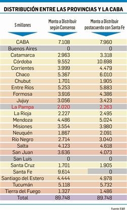 Quedan excluidas del lote que recibirá el bono las provincias de Buenos Aires (beneficiada por el fin del techo al Fondo del Conurbano), de San Luis (no firmó el Pacto) y de La Pampa, que lo rubricó, pero hasta ahora no fue avalado por la Legislatura (ver aparte). En tanto, Santa Fe percibirá los bonos hasta tanto acuerde un plan de pagos con la Casa Rosada por una sentencia favorable en la Corte (ver página 18), y luego deberá devolverlos para ser distribuidos entre el resto de las provincias.
