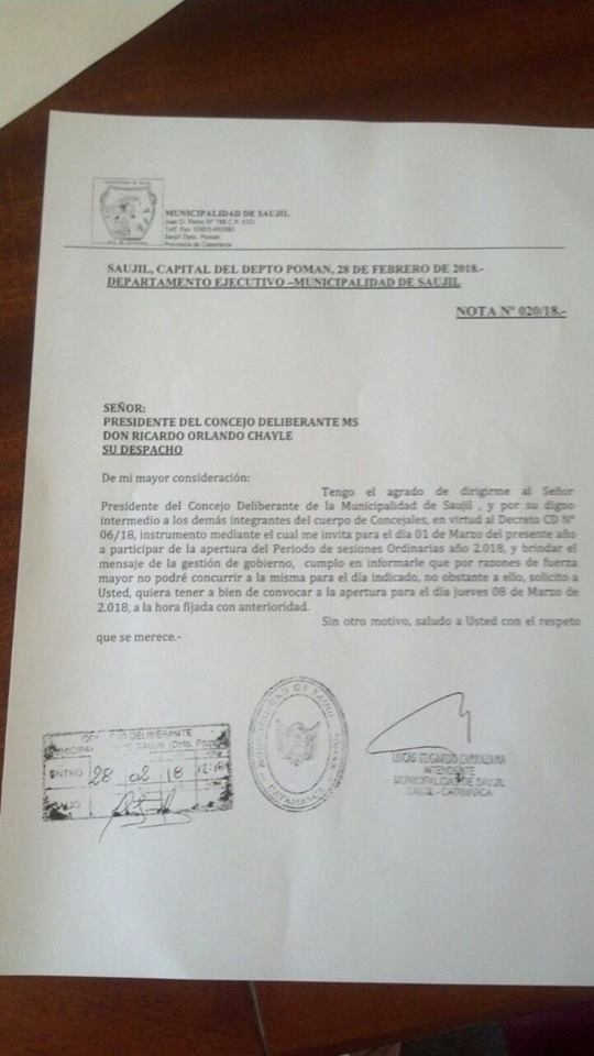 Por el mismo instrumento, se invitó al intendente Lucas Carrazana para que pronuncie su mensaje de ocasión. Sin embargo, por nota número 020/18, el jefe comunal comunica que por razones de fuerza mayor no puede asistir y que le será posible recién el día 8 de marzo 2018.