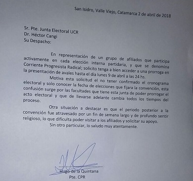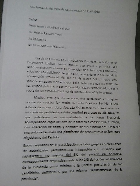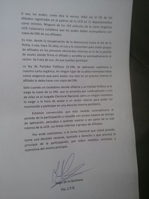 "Los avales deben ser el 5% de los afiliados registrados en el padrón de la UCR, en 11 departamentos como mínimo. Ninguno de los 163 artículos de la carta orgánica de la UCR Catamarca, establece que los avales deben acompañarse con copia del DNI de sus afiliados. Estamos convencidos que esta medida contradictoria al sentido de participación y resuelta con escaso espacio de tiempo de aplicacion, perjudica a quienes aspiran a ser parte de la vida política de la UCR, sus líneas internas, o grupos de afiliados", agrega.