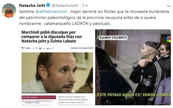 "Sentíme @alfredmarchioli , mejor devolvé los fósiles que te choreaste burlándote del patrimonio paleontológico de la provincia neuquina antes de si quiera nombrarme, catamarqueño LADRÓN y pelotudo".