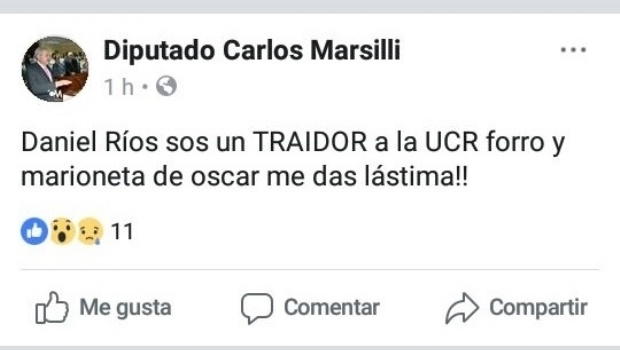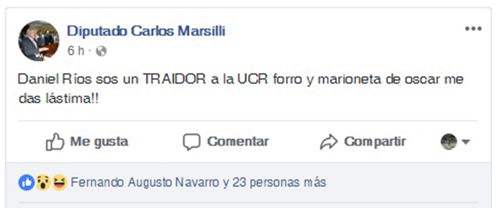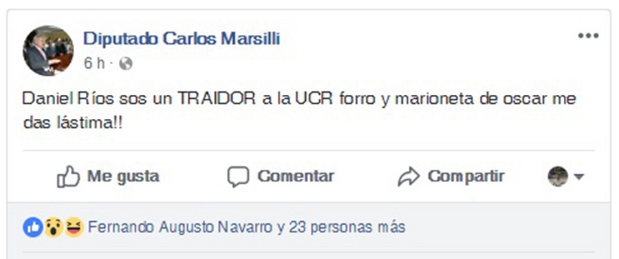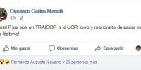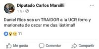 “Daniel Ríos sos un TRAIDOR a la UCR forro y marioneta de Oscar, me das lástima!!”, escribió el legislador santamariano en la red social Facebook, mostrando su enojo con el intendente de belén.
