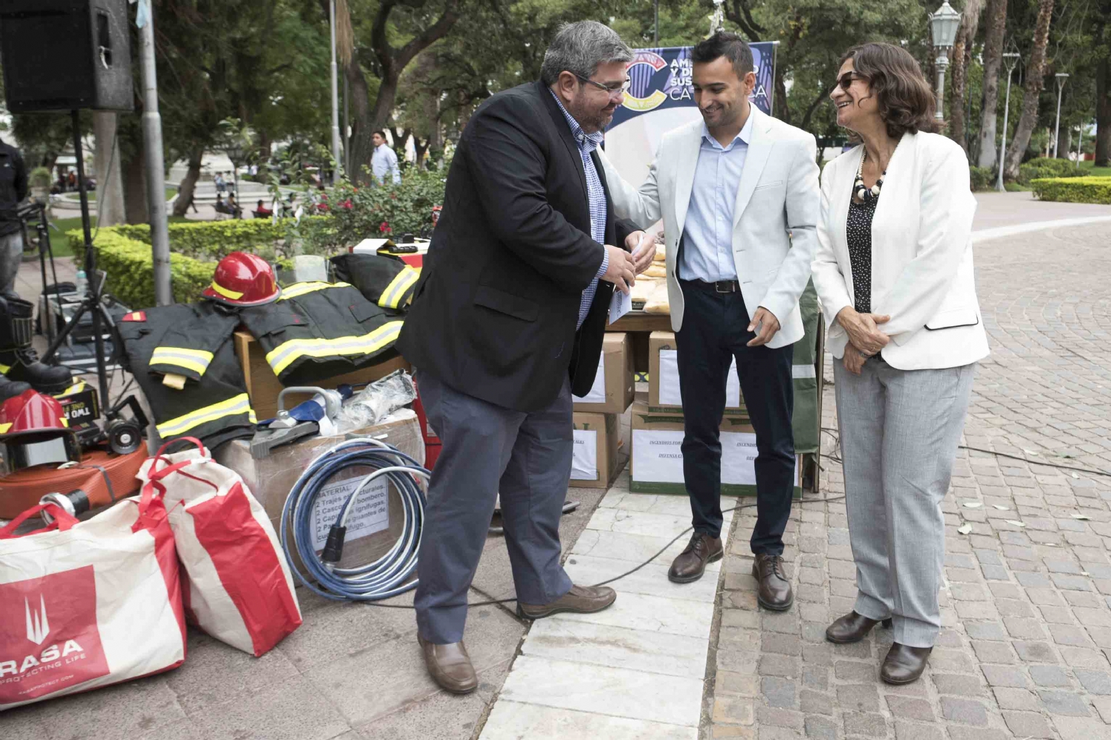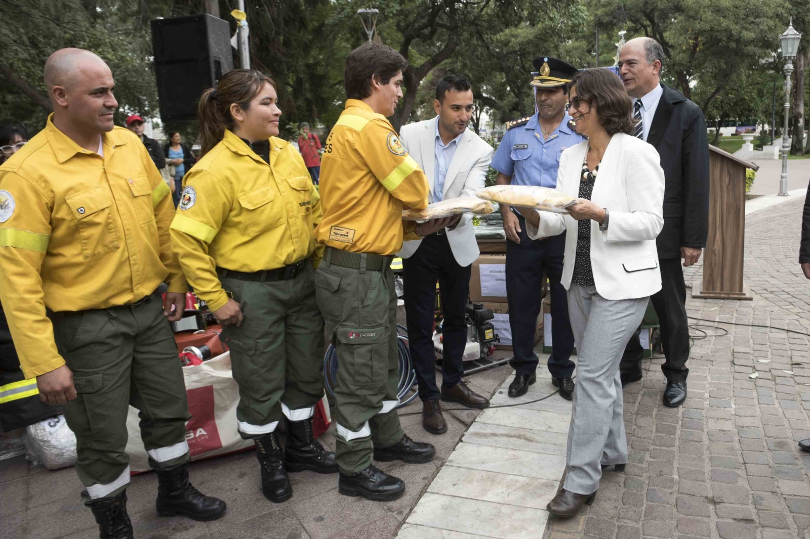 La gobernadora Lucía Corpacci entregó, esta mañana en el Paseo de la Fe, 52 equipos de protección personal para combate de incendios forestales, y también entregó fondos de incentivos para beneficiaros de los proyectos de conservación de bosques nativos.
