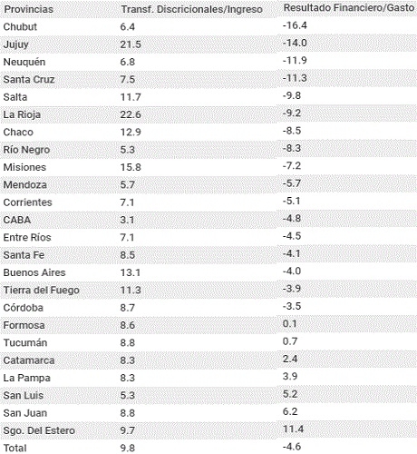 El informe de la Fundación Mediterránea analiza, además, la relación entre las trasferencias y el desempeño de las finanzas en cada provincia, cuyo indicador es, ente caso, el resultado financiero.