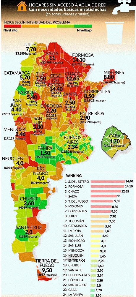 “El objetivo de recolectar la información es hacer un aporte a la gestión hídrica integrada, es decir abarcar agua y saneamiento”, agregó la experta que recorrió junto al equipo varios puntos del país para poder corroborar cifras y experiencias. Los resultados, que se obtuvieron utilizando los datos del Censo 2010, de las EPH y de las visitas de campo, son alarmantes en algunos territorios. Santiago del Estero, Formosa, Chaco, Salta y Tierra del Fuego figuran primeras en el ranking si se analiza la falta de acceso al agua de red. Con el orden apenas cambiado, aparecen los mismos distritos sin acceso a cloacas: Chaco, Formosa, Salta y Tierra del Fuego.