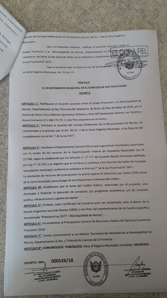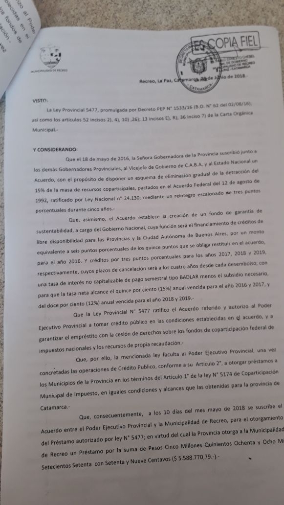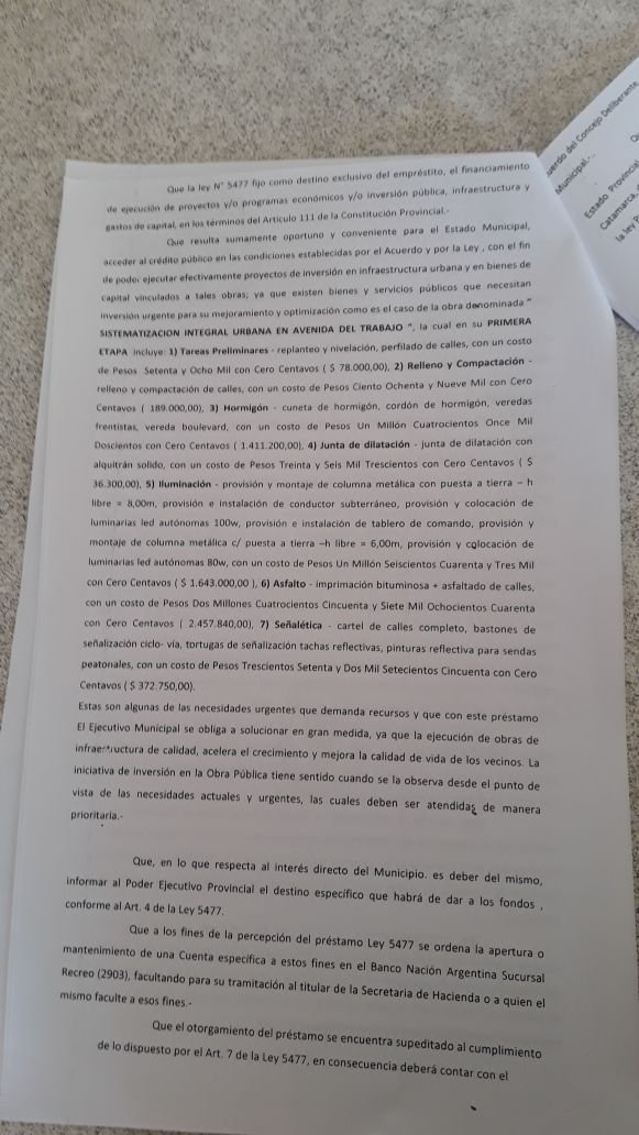 En la sesión estaba previsto que se trate el proyecto a través del cual se solicita que se preste "acuerdo" a un nuevo empréstito de $ 5.588.770,79 de pesos, solicitado por el intendente Roberto Herrera, que sería pagado "con la cesión de recursos de la Coparticipación Federal".