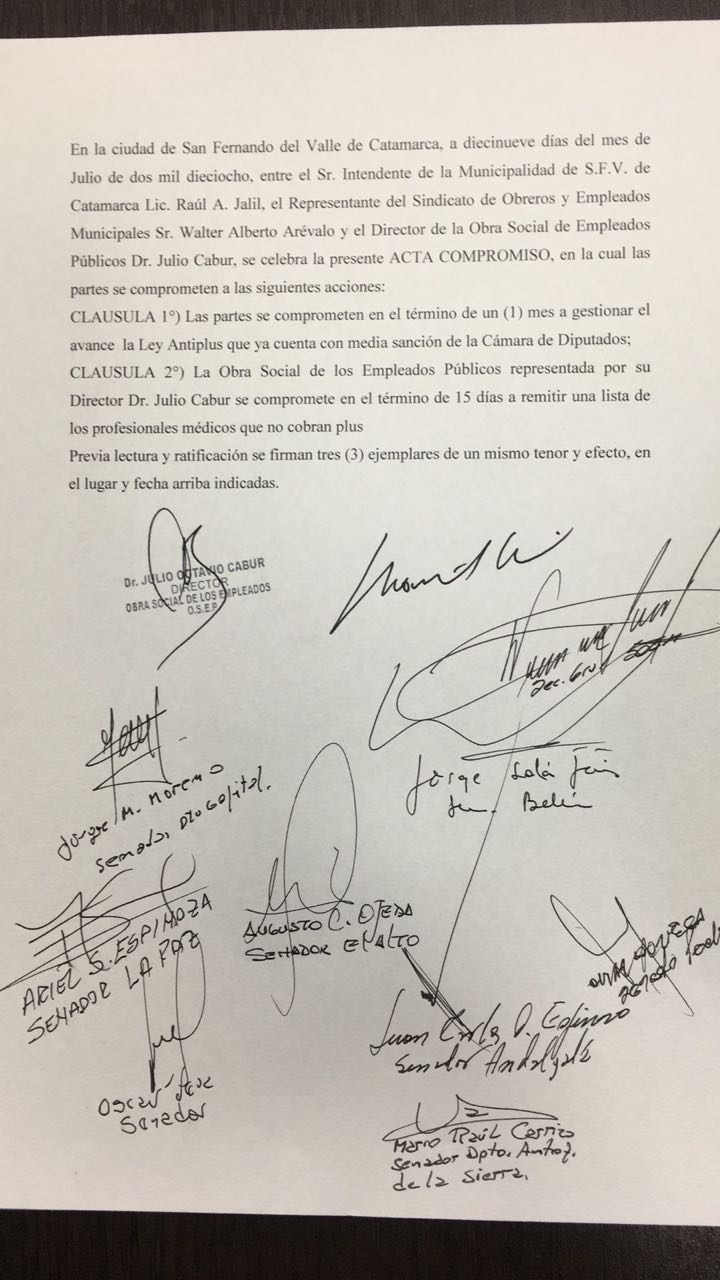 Asimismo, como segunda medida compromete a la Obra Social de los Empleados Públicos, representada por Julio Cabur, a emitir en 15 días una lista de los profesionales médicos que no cobran plus.