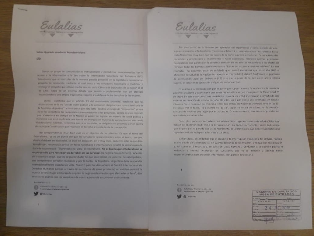 La nota de “Las Eulalias” dirigida al diputado provincial Francisco Monti es la siguiente: