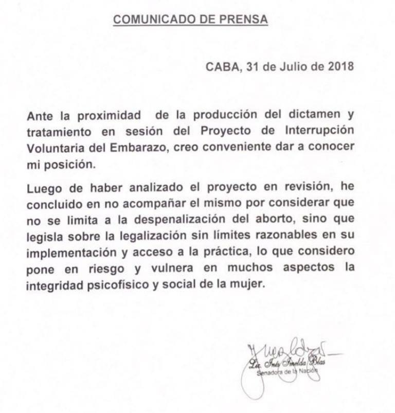 "Luego de haber analizado el proyecto en revisión, he concluido en no acompañar el mismo por considerar que no se limita a la despenalización del aborto, sino que legisla sobre la legalización sin limites razonables en su implementación y acceso a la práctica, lo que considero pone en riesgo y vulnera en muchos aspectos la integridad psicofisica y social de la mujer", esgrimió la legisladora.