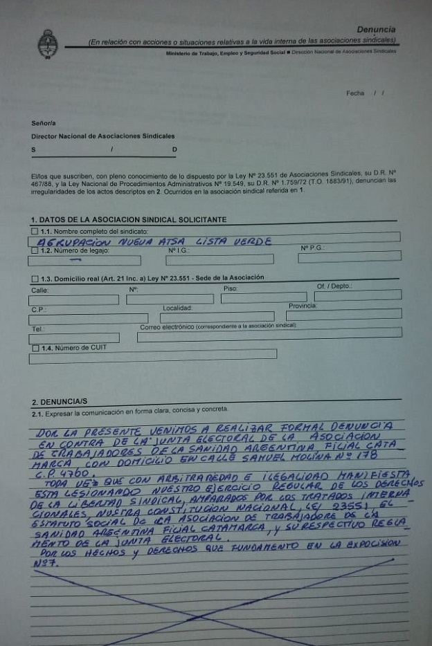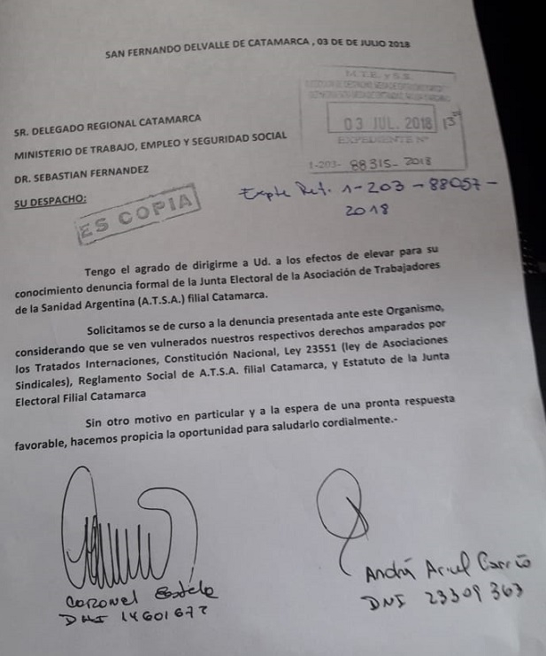 Las presentaciones, hechas ante el Delegado Regional Catamarca del Ministerio de Trabajo, Empleo y Seguridad Social de la Nación, Dr. Sebastián Fernández, y la Dirección Nacional de Asociaciones Sindicales, con fecha 03 de julio del corriente año, fueron suscriptas por Andrés Ariel Carreño, DNI 23.309.363 y Estela Coronel DNI 14.601.672, en representación de la “Lista Verde-Nueva ATSA).