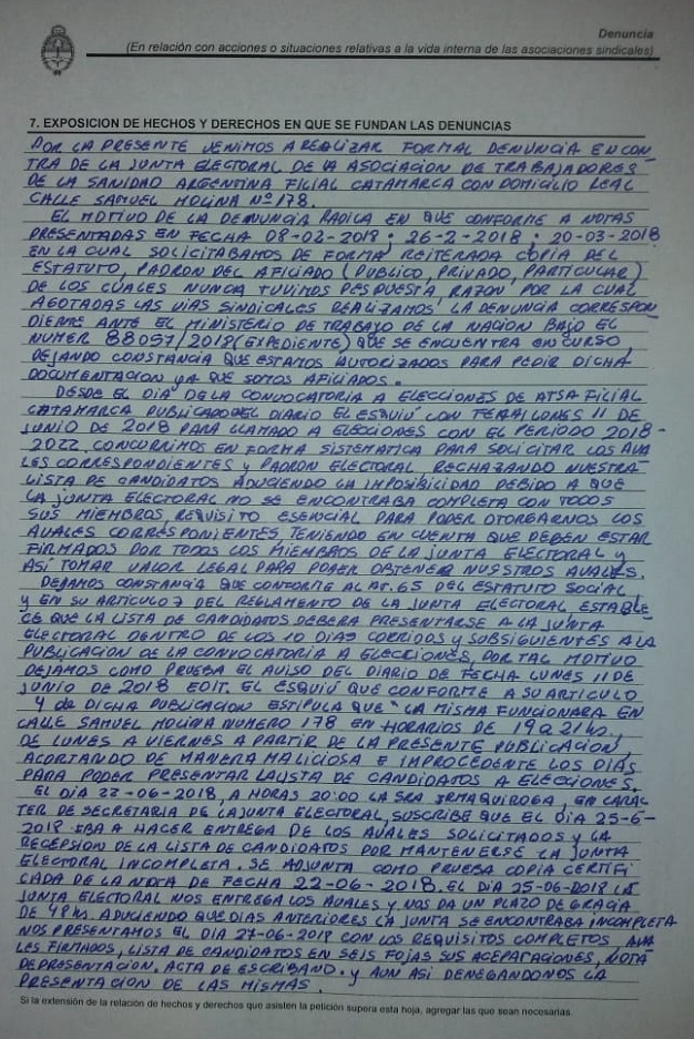 En la “Exposición de Hechos y Derechos” en que se fundan las denuncias, se expone que la referida Junta Electoral de la ATSA “con arbitrariedad e ilegalidad manifiesta está lesionando nuestro ejercicio regular de los derechos de la libertad sindical, amparados por los tratados internacionales, la Constitución Nacional, la Ley 23351 de Asociaciones Sindicales, el Estatuto de la Junta Electoral filial Catamarca y el respectivo Reglamento Social de ATSA filial Catamarca”.
