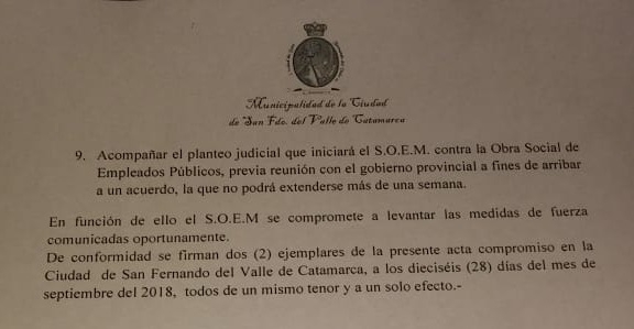 Además de un acuerdo de aumento salarial de $2000 para los trabajadores, que se pagará en Octubre garantizado un sueldo mínimo de $20.200, el municipio se comprometió, entre otras medidas, a no descontar los días de paro; y si no hay un acuerdo por el tema del cobro del plus médico, el municipio acompañará al SOEM en la presentación de una medida judicial que obligue al cumplimiento del convenio firmado entre la Obra Social de los Empleados Públicos, y el Círculo Médico.