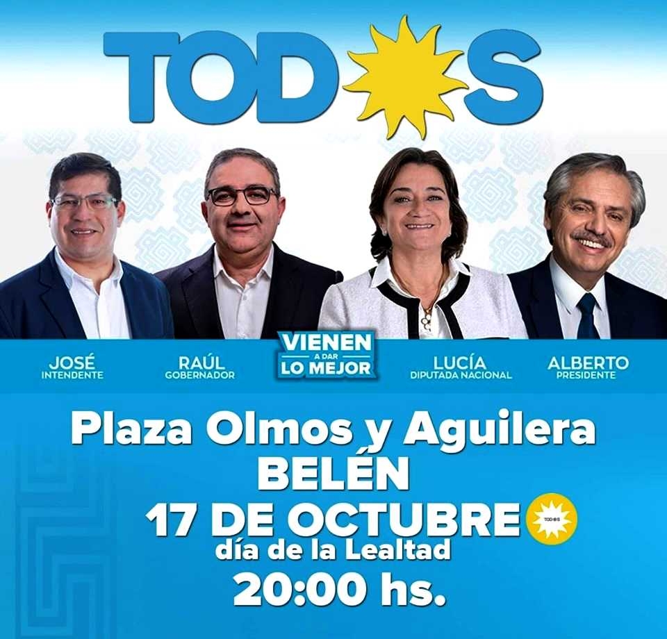 Para referirse a esta convocatoria, el candidato a intendente de Belén por el “Frente de Todos”, Prof. José Peñaloza manifestó, comentó que “Los integrantes del Movimiento Justicialista del Departamento Belén nos reuniremos este 17 de octubre de 2019, a las 20 hs., para llevar a cabo el Acto Central de conmemoración de uno de los días más caro para el sentimiento Peronista, que es el acto de la Lealtad, con la presencia de la Sra. Gobernadora, nuestra querida compañera Lucía (Corpacci)”.