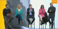Corpacci está sentada junto al postulante a jefe de gobierno de la ciudad de Buenos Aires, Matías Lamens, al gobernador de Santiago del Estero, Gerardo Zamora, y la intendente del Partido de La Matanza, Verónica Magario.