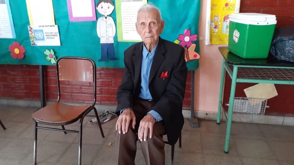 El señor José Lidoro Narváez tiene 100 años y ya emitió su voto en la Escuela Moreno. Nació el 8 de septiembre 1919 y concurrir a votar es un verdadero placer para él.