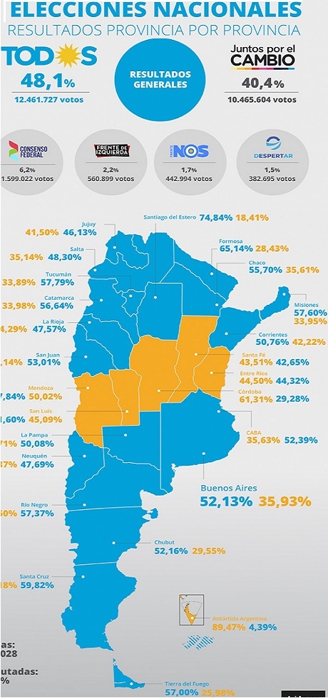 El Frente de Todos se impuso por diez puntos (47,68%) a Juntos por el Cambio (37,37%) en la elección presidencial y en consecuencia obtuvo dos bancas en el Senado y una en la Cámara de Diputados de la Nación a partir del 10 de diciembre próximo.