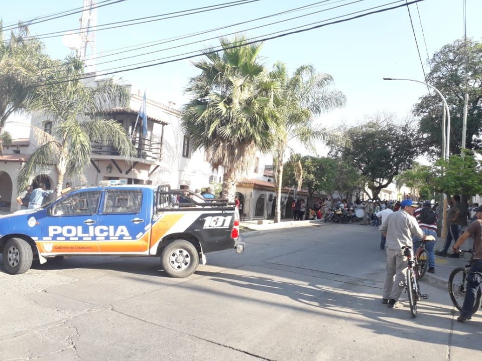 Un grupo de empleados de planta permanente se manifiesta frente a la Municipalidad de Andalgalá solicitando a los trabajadores que toman el palacio municipal que liberen el paso para poder cobrar.