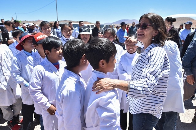 Además, la responsabilidad social empresarial también está destinada para obras para ustedes. La empresa Galaxy solo con los fondos de RSE, porque todavía no está pagando regalías dado que aún no produce litio, está haciendo la escuela de El Peñón y la ampliación de la escuela de Antofagasta. No son regalías, no es fideicomiso, es RSE. Y son ustedes los que definen en qué se usan esos fondos. Estamos haciendo las escuelas que ustedes pidieron.