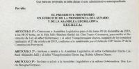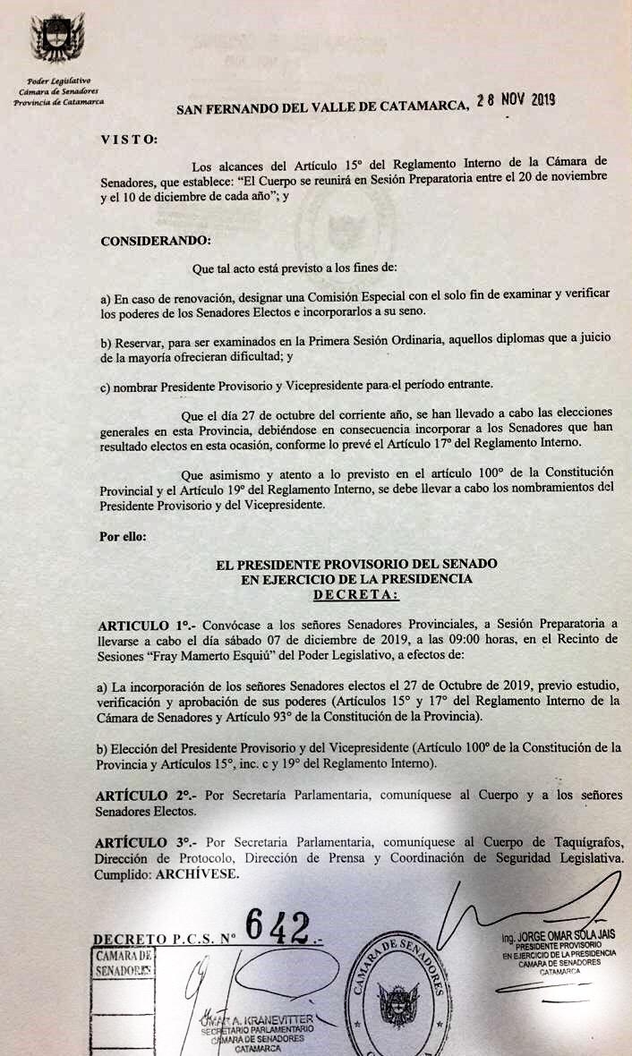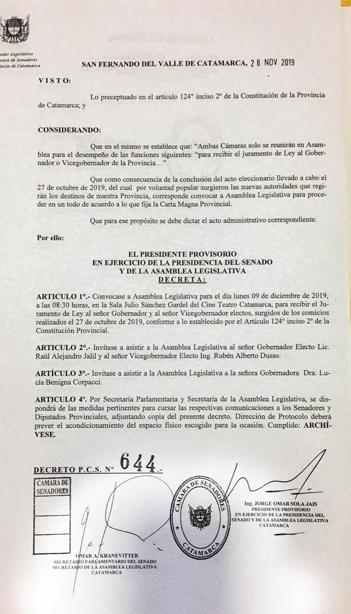 El Presidente Provisorio del Senado de Catamarca, Jorge Solá Jais mediante Decreto N° 644, convoca a Asamblea Legislativa para el lunes 9 de diciembre a las 8.30 en la Sala Julio Sánchez Gardel del Cine Teatro Catamarca, para recibir el juramento de Ley a los señores Gobernador y Vicegobernador electos el pasado 27 de octubre, Raúl Jalil y Rubén Dusso, respectivamente, conforme a lo establecido por el Artículo 124° inciso 2° de la Constitución Provincial.
