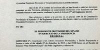 Dicha convocatoria, es a efectos de tomar juramento a los nuevos Senadores, previo estudio, verificación y aprobación de poderes; como así también, la elección del Presidente Provisorio y Vicepresidente del Cuerpo, conforme lo prevé el Artículo 100° de la Constitución Provincial y el Artículo 19° del Reglamento Interno.