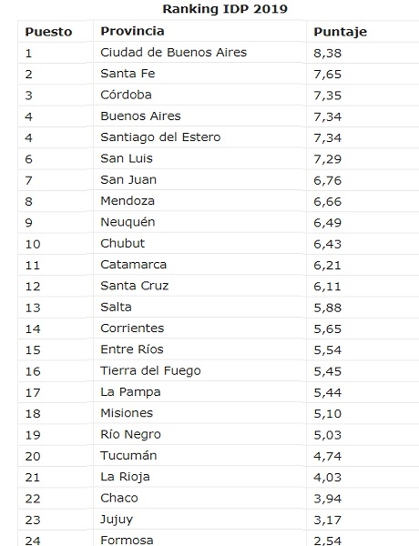 Los resultados del IDP muestran, una vez más, que las provincias líderes y las de más baja calificación en el ranking básicamente son las mismas desde la primera edición. Específicamente, por decimoquinto año consecutivo, Ciudad de Buenos Aires lidera el ranking mientras que Formosa se adjudica la última posición. Esto demuestra que las heterogeneidades provinciales adquieren un carácter estructural. Por su parte, la ciudad de Buenos Aires, ocupa el primer lugar en el ranking.